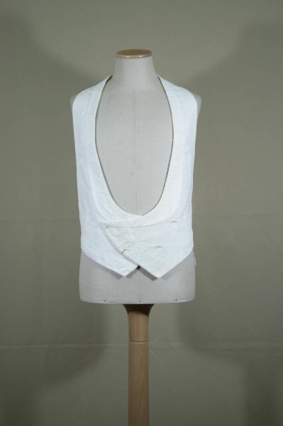 Gilè ad un petto da smoking, in piquet bianco, doppiopetto con quattro occhielli per lato, disposti con andamento triangolare, collo a scialle e due tasche a patta cucita; il dorso è defnito da un passante con asola finale dove far passare le due bande laterali, chiuso a un bottone e da un occhiello. Fodera in tela di cotone con pieghe in corrispondenza degli occhielli.