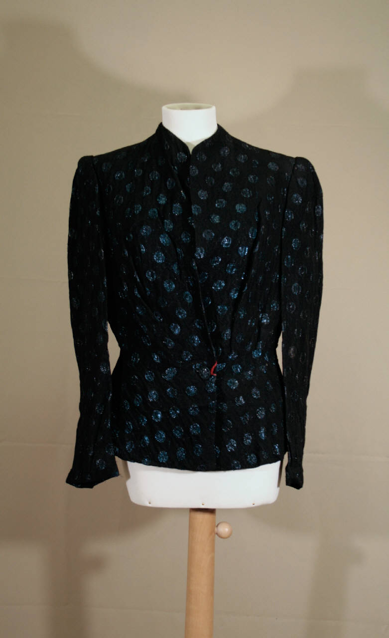 Giacca in crespo di seta nero decorato da pois azzurri. Corta ai fianchi, spalle imbottite, ad un petto scollo montante con apertura anteriore, è modellato da un taglio che dalla spalla arriva sino alla vita, segnata da un motivo di finta cintura che prosegue anche sul dorso. Abbottonatura data da un bottone ed un occhiello in vita. Maniche lunghe dritte. Fodera in crespo nero, su cui è cucita l'etichetta.