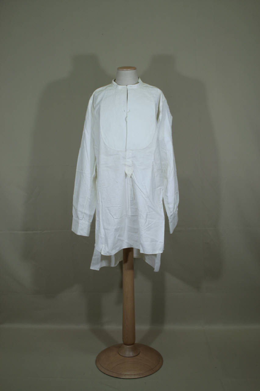 Camicia maschile in tela bianca con collo a cinturino con tre occhielli, sprarato in piquet inamidato data da due occhielli e abbottonatura parziale con un bottone e un occhiello, terminante con un piccolo cappio sagomato con due occhielli, piccolo sprone sul retro, che trattiene una ricca arricciatura. Orlo dei fianchi stondati e lunghezza maggiore del dorso. Maniche lunghe blusanti con gherone e polsino con due occhielli e spacco con occhielli. Etichetta sul rovescio, all'altezza dello sprone.