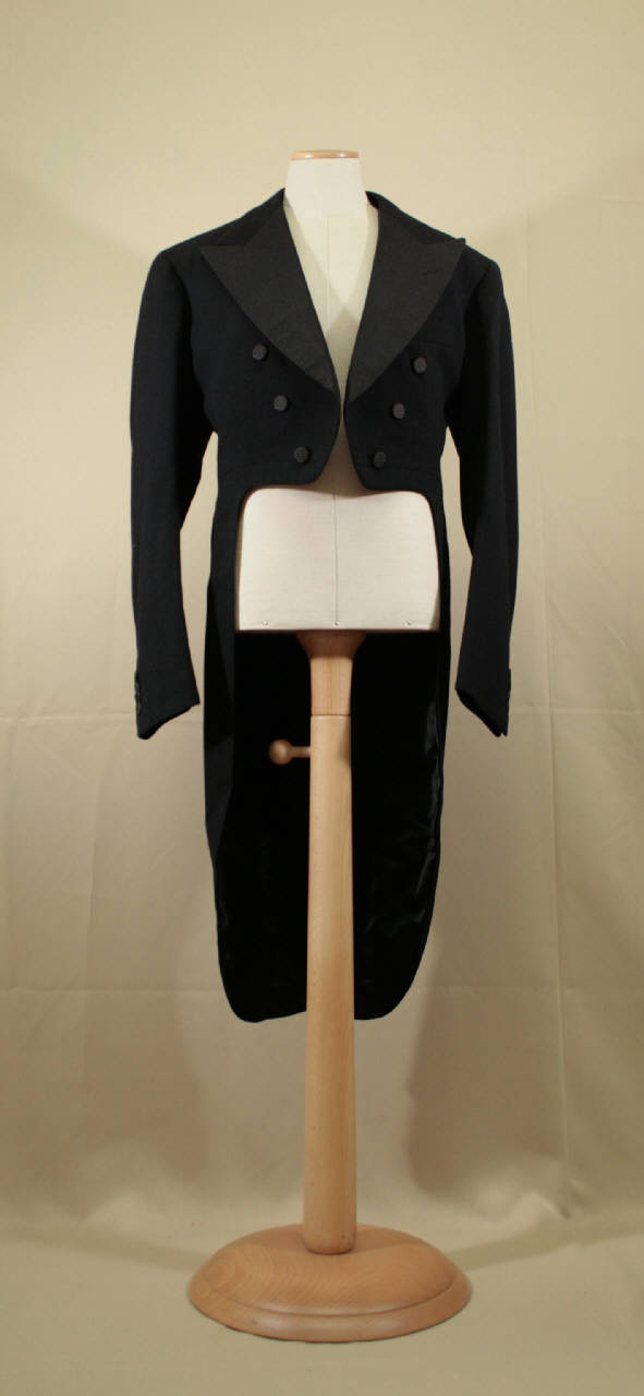 Giacca in panno nero, con collo con risvolti a lancia con occhielli, sei bottoni rivestiti con fili di seta nera disposti in diagonale; taglio in vita da cui parte la falda che continua posteriormente con la foggia "a coda di rondine", unendosi sul dorso contraddistinto da tagli, che celano una tasca, e dalla cucitura centrale con spacco; due bottoni segnano il punto vita. Maniche in due pezzi con spacco al polso e quattro bottini. Tasca interna a filetto dove è cucita l'etichetta. Fodera in diagonale di seta nera e per le maniche in diagonale crema.