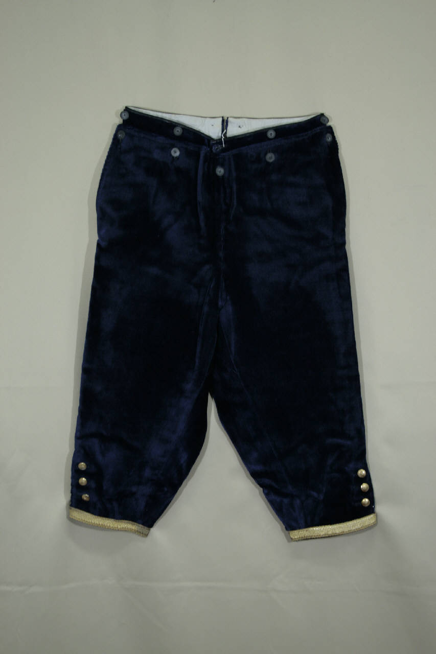 Calzoni in velluto blu, con cintura sagomata con sei bottoni, patta alla marinara chiusa da cinque bottoni, con apertura centrale anteriore verticale, chiusa da tre bottoni;due tasche a filetto disposte in diagonale. La cintura prosegue sul dorso con spacco al centro e cintura con fibia metallica; dorso modellato da una coppia di pinces. Ogni calzone è fermato al ginocchio da tre bottoni in metallo, con altrettanti occhelli, e da un cinturino con fibia. Il cinturino e formato da un un gallone dorato. Fodera parziale in diagonale di cotone grigio.