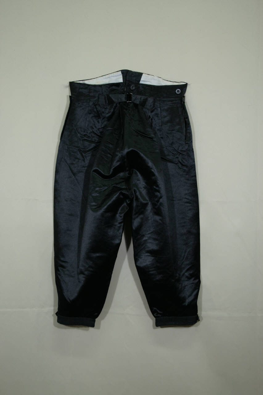 Calzoni in raso nero, con alta cintura sagomata con sei bottoni, abbottonatura nascosta data da patta verticale chiusa da sei bottoni, con altrettanti occhielli, più uno posto sulla cintura; una tasche inserita nella cucitura della cintura. La cintura prosegue sul dorso con spacco al centro e cintura con fibia metallica; dorso modellato da una coppia di pinces. Ogni calzone è fermato al ginocchio da tre bottoni in metallo con stemma con altrettanti occhelli, e da un cinturino con fibbia. Doppiato in diagonale di cotone rosaceo.