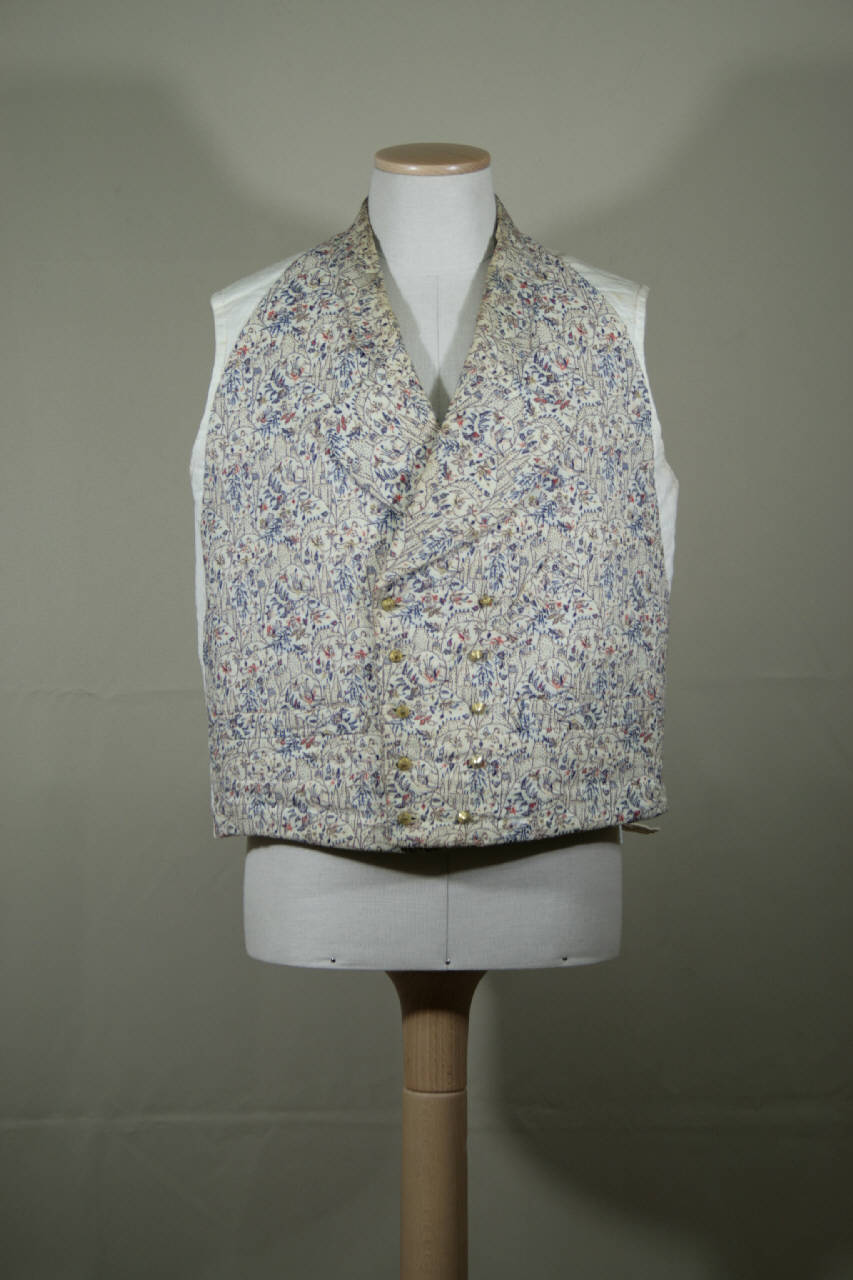 Gilè tagliato all'altezza della vita, doppiopetto, con cinque occhielli edieci bottoni in metallo, collo con risvolti, tre tasche con patta cucita. E' confezionato con diagonale di lana avorio decorata cpn un motivo a lambicchi e tralci fioriti, realizzati con trame supplementari in lana (blu e amaranto) e seta (crema); il tessuto è impiegato ruotato di 180°. Dorso in tela di lino écru in un pezzo con cinturino con fibbia metallica. I quarti anteriori sono doppiati in tela di lino che trattiene una imbottitura.
