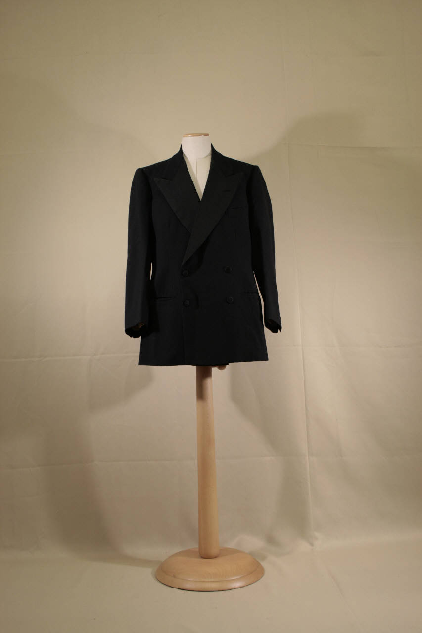 Completo composto da giacca e pantaloni in tela di lana nera. Giacca doppiopetto, chiuso quattro bottoni rivestiti in fili di seta e altrettanti occhiell, collo co risvolti a lancia rivestito in cannetttato nero e co occhiello, modellata da pinces, due tasche a filetto e una con patta rettangolare cucita; dorso con cucitura centrale; spalle imbottite; maniche in due pezzi con spacco sulla manica con quattro bottoni e altrettanti occhielli. Fodera in raso nero e per le maniche in taffetas avorio; tasca interna con filetto dove è applicata l'etichetta. Pantalone lungo classico, con cintura, 4 pinces aperte, tasche inserite nella cucitura dei fianchi sottolineati da da un nastro in seta nera; chiusura nascosta mediante patta dove sono quattro bottoni e altrettanti occhielli; un altro bottone è sulla cintura; sul dietro spacco in vita, pinces chiuse. Sulla cintura sono applicati sei bottoni. Cintura foderata in raso di cotone nero. L'etichetta è cucita sulla fodera delle tasche.