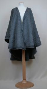 Mantello corto al ginocchio, in lana diagonale grigia, a sezione circolare, privo di collo, più corto anteriormente, con il bordo e l'orlo rifiniti con una treccia creata da fettucce nere. Etichetta cucita sul rovescio.