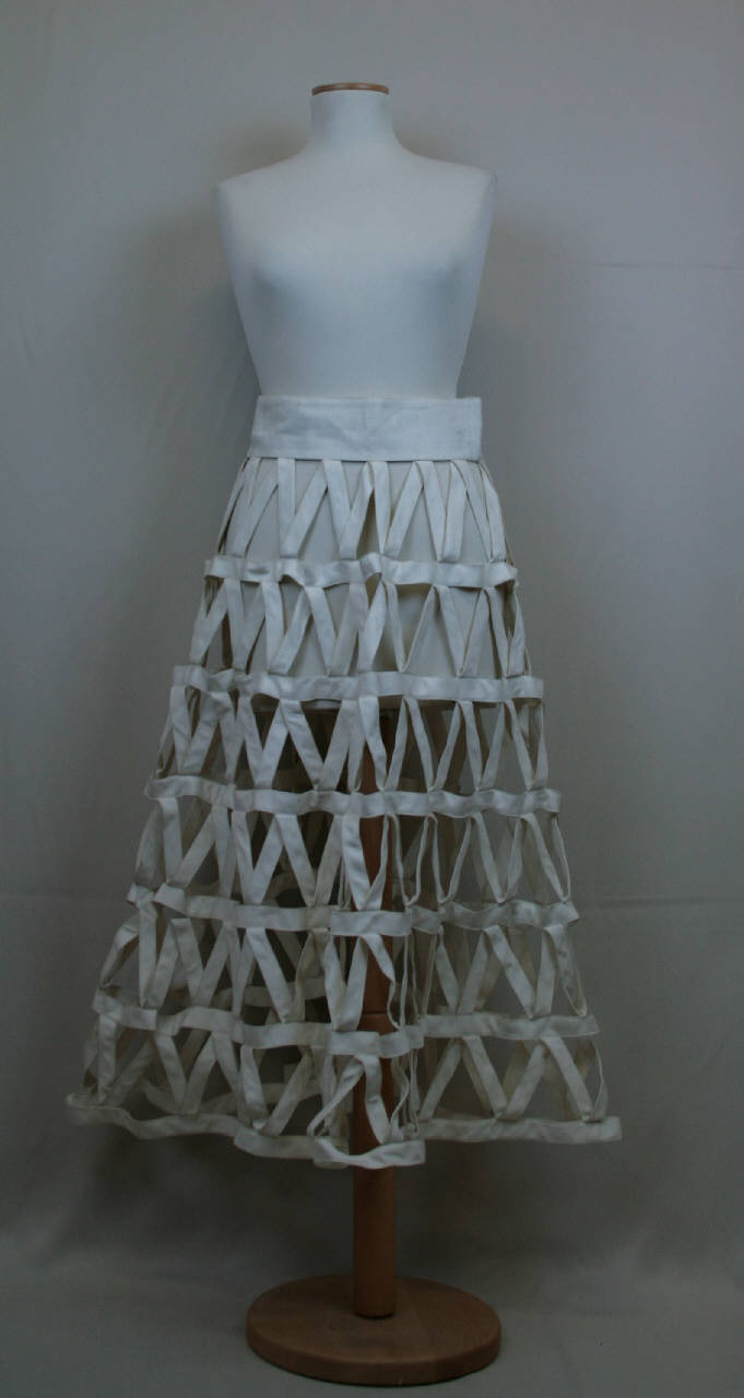 Gonna svasata lunga creata da nastri in tela di cotone: cintura alta chiusa posteriormente da tre coppie di occhielli e da tre automatici. La gonna è costituita da sei bande orizontali unite dai nastri disposti con andamento a zig-zag.