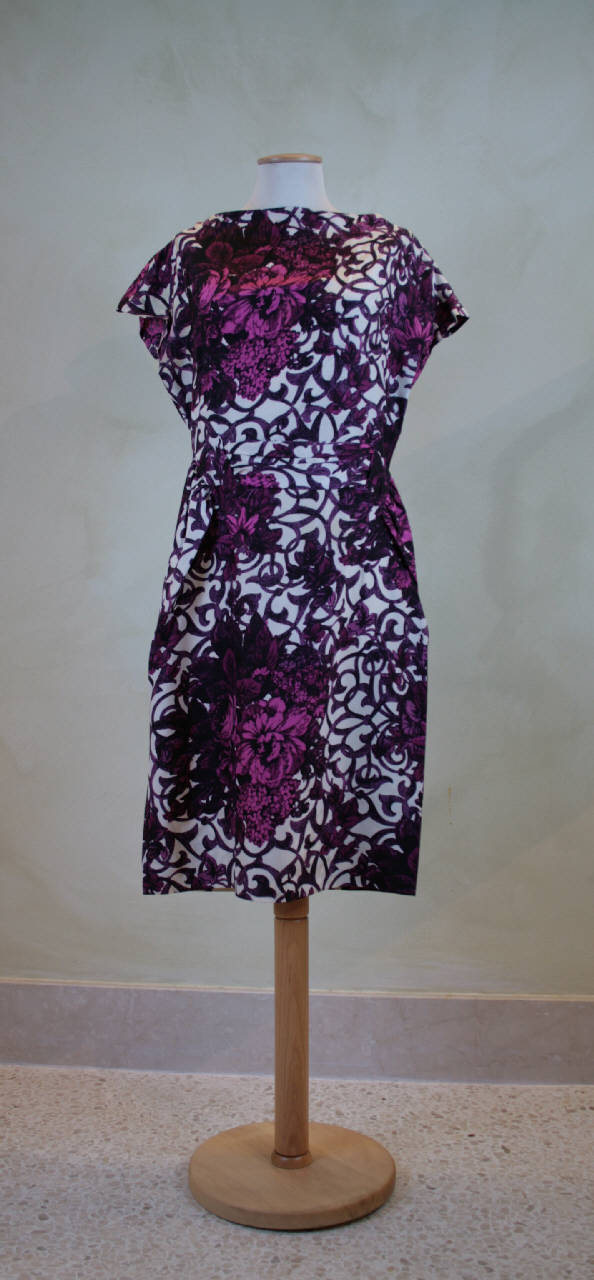 Completo costituito da soprabito e vestito. Soprabito in nattè di seta viola, lungo al ginocchio, linea dritta modellata da fianchette e pinces al seno, collo a cinturino decorato da un fiocco, chiusura centrale definita da sette grandi bottoni rivestiti in tessuto e altrettanti occhielli; manica raglan al gomito; cucitura centrale posteriore; fodera in taffetas viola. Abito al ginocchio in taffetas stampato con motivi di arabeschi e grandi fiori naturalistici giocati sui toni del viola e bordeaux; linea aderente definita da tagli e pinces, scollo a goccia; anteriormente il punto vita è sottolineato da un dreppeggio e da una finta cintura; privo di cuciture sui fianchi; fianchetto sul retro e cucitura centrale dove è inserita la cernierae un gancio.