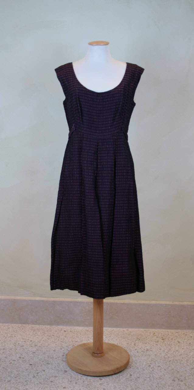 Abito confezionato con taffetas goffrato cangiante (con ordito nero e trame alternativamente nere e viola). Scollo rotondo, privo di maniche, con tagli e pinces che modellano il busto e creano un motivo a finta cintura che abbraccia la vita anteriormente e posteriormente; anteriormente il punto vita è segnato da un taglio sagomato. Dal taglio in vita si unisce la gonna molto svasata, mossa sul davanti da 4 pieghe piatte, con cucitura anteriore e posteriore. La cernieraè posta sulla cucitura del fianco sinistro. Retro e cucitura centrale dove è inserita la cernierae un gancio. Sul rovescio è cucita l'etichetta.