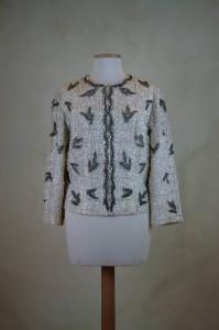 Giacca in taffetas avorio ricoperto di paillettes traspareti e ricamato con perline che creano piccoli segmenti che incorniciano foglie stilizzate in cannette; le stesse foglie si dispongono sullo scollo e lungo l'apertura centrale anteriore. Scollo a girocollo, linea a sacco corta ai fianchi, chiusura definita da una zip. Fodera in taffetas avorio dove è cucita l'etichetta.