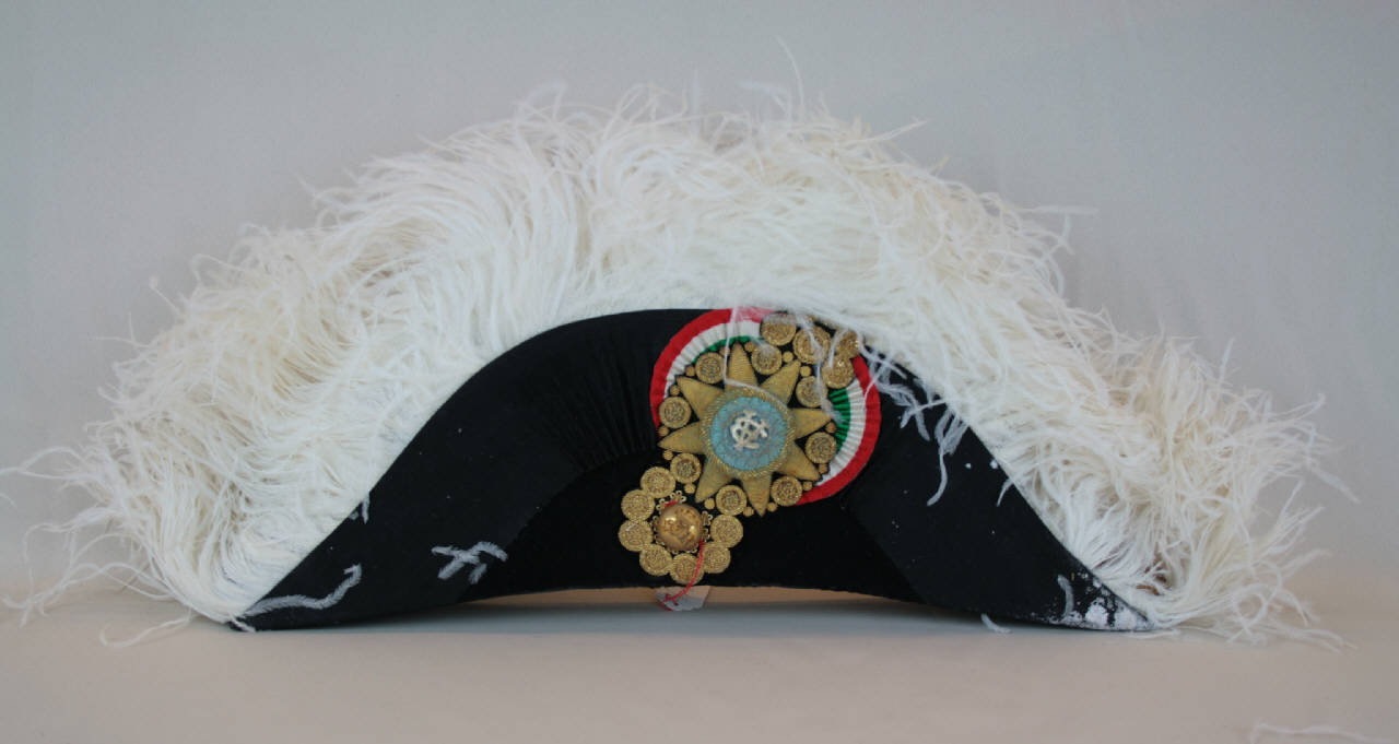 Bicorno o feluca in feltro nero con calotta a due ali rialzate, guarnite con piume di struzzo bianche e un nastro in taffetas nero marezzato; ornamento definito da patta ricamata su raso nero con canutiglia dorata e paillettes con cornici circolari che incorniciano una croce con monogramma di Vittorio Emanuele III; bottone con il motto FERT e la corona reale, coccarda in raso di seta col tricolore italiano. Fodera in raso nero su cui è cucita l'etichetta. Conservato nella sua scatola originale, sagomata, con coperchio chiuso da fettucce in cotone, in cartone marrone, interno in carta bianca.