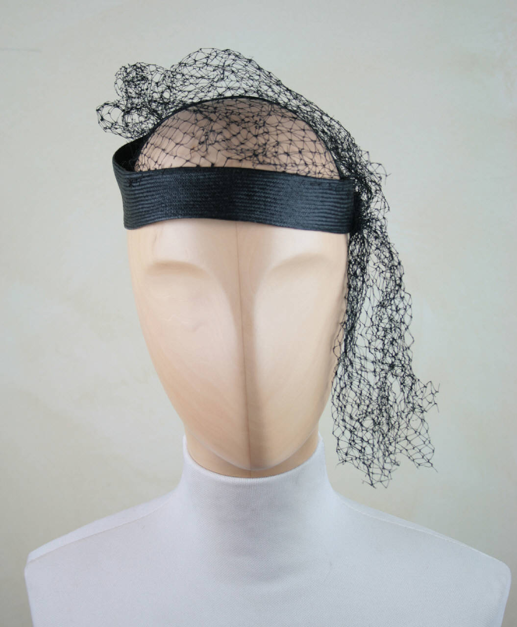 Copricapo in paglia nera intrecciata definito da una sorta di calotta di forma pressochè a tronco di cono movimentato da pieghe aperte; tesa creata da un nastro in paglia rigido a cui è cucita la veletta in tulle nero. Nastro di gros nero sul giro d'entrata.
