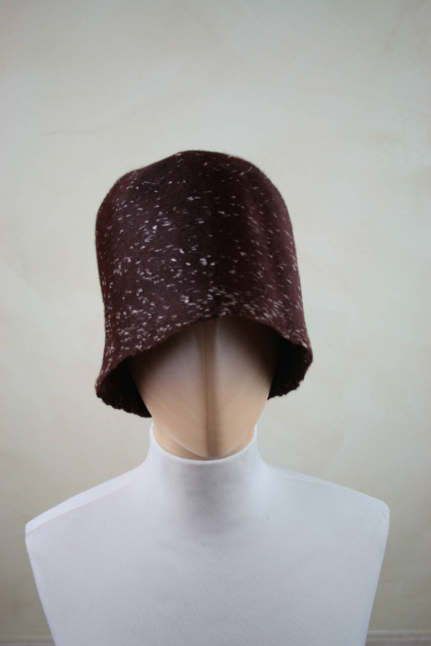 Cloche con cupola in feltro marrone screziato di bianco. Sul feltro è stampato il marchio.