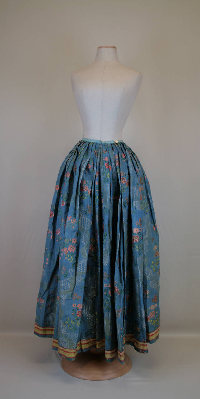 Gonna lunga, confezionata con otto pannelli di gros broccato: sul fondo azzurro si staglia un meandro definito da un merletto bianco, da cui si originano tralci fioriti e fronzuti; il decoro è dato da trame in seta policroma. Cintura in taffetas azzurro, chiusa posteriormente, in corrispondenza dell' apertura della gonna; vita mossa da numerose pieghe aperte; sull'orlo scorre un nastro in raso di seta rigato giallo e rosso, decorato da un sinuoso tralcio fiorito.L'orlo è rifinito con un nasto di tela di lino ceruleo.