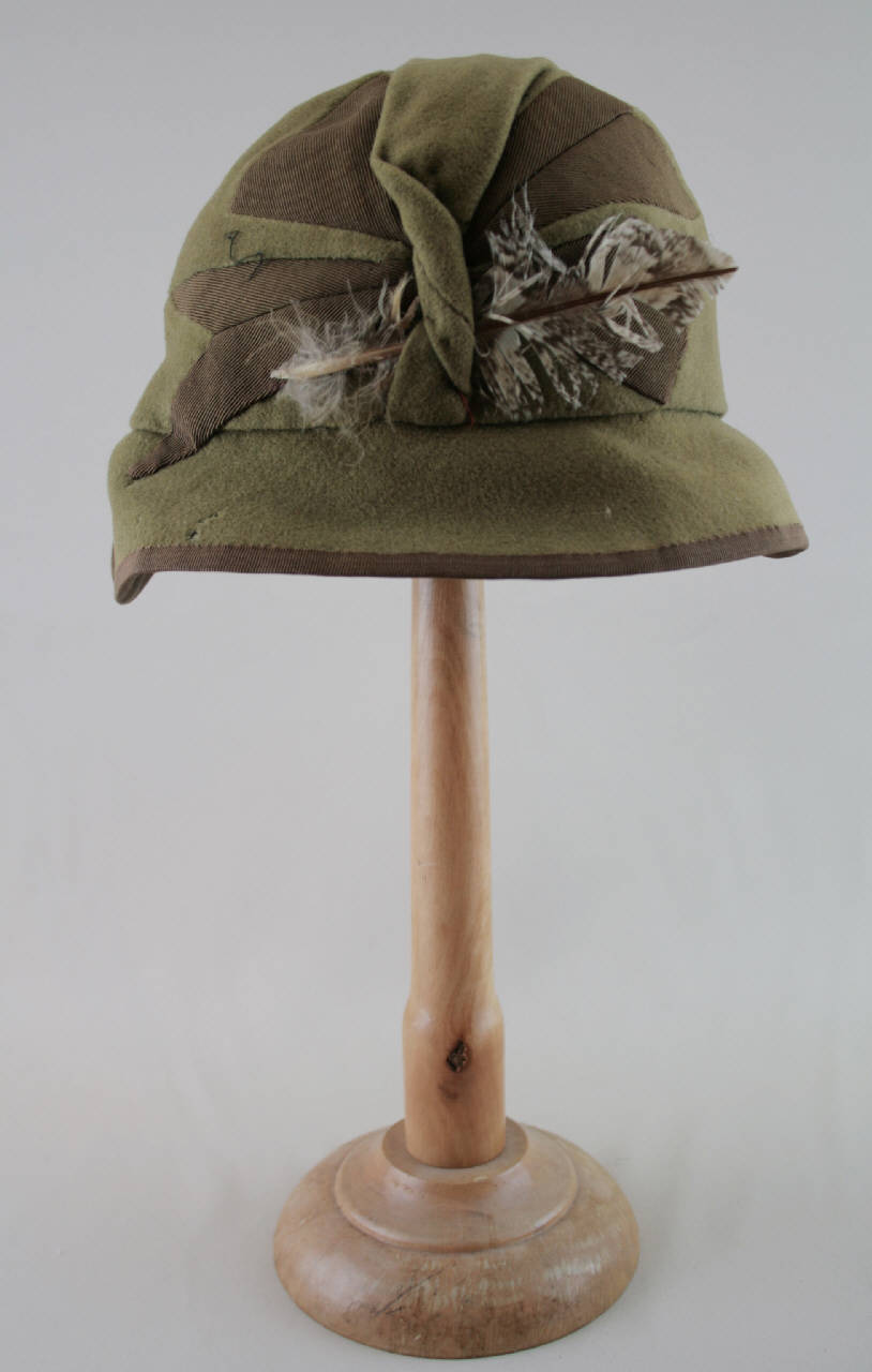 Cloche confezionata in diagonale verde; cupola morbida e rotonda decorata, anteriormente, da un motivo a nodo sottolineato da inserti triangolari in gros nero, un inserto continua anche nella piccola tesa ribordata in gros. Il nodo è impreziosito da una piuma. In origine era foderato in taffetas nocciola, di cui rimangono frammenti.