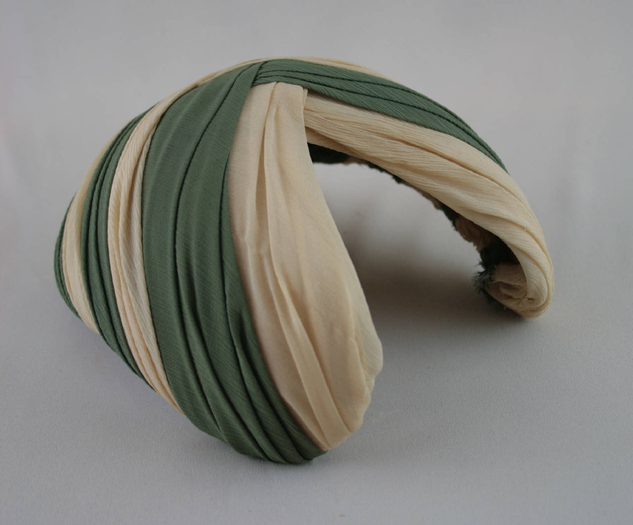Toque con struttura in paglia intrecciata ricoperta da bande drappeggiate in crepé verde e beige, disposte a lisca di pesce; calotta a foggia di cuore, con il bordo rinforzato da fil di ferro.