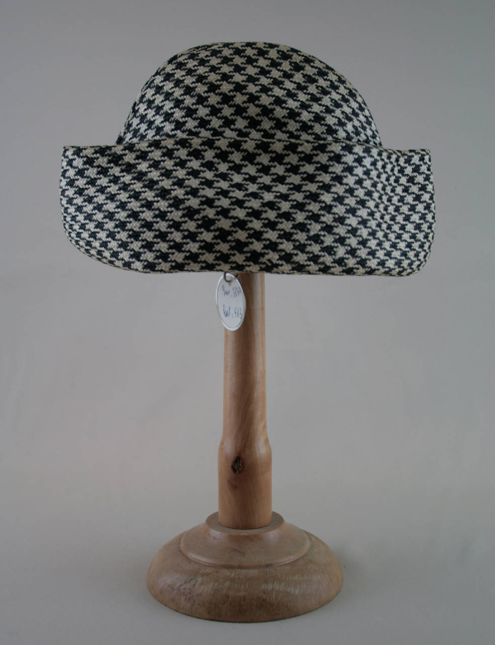 Breton realizzato in paglia bianca e nera intrecciata in armatura saia 3/1 ricreando l'effetto pied de poule. Calotta rotonda modellata da cuciture; alta tesa sollevata; nastro in gros nero, su cui è cucita l'etichetta, sul giro d'entrata. Internamente la calotta è sostenuta da tulle nero.