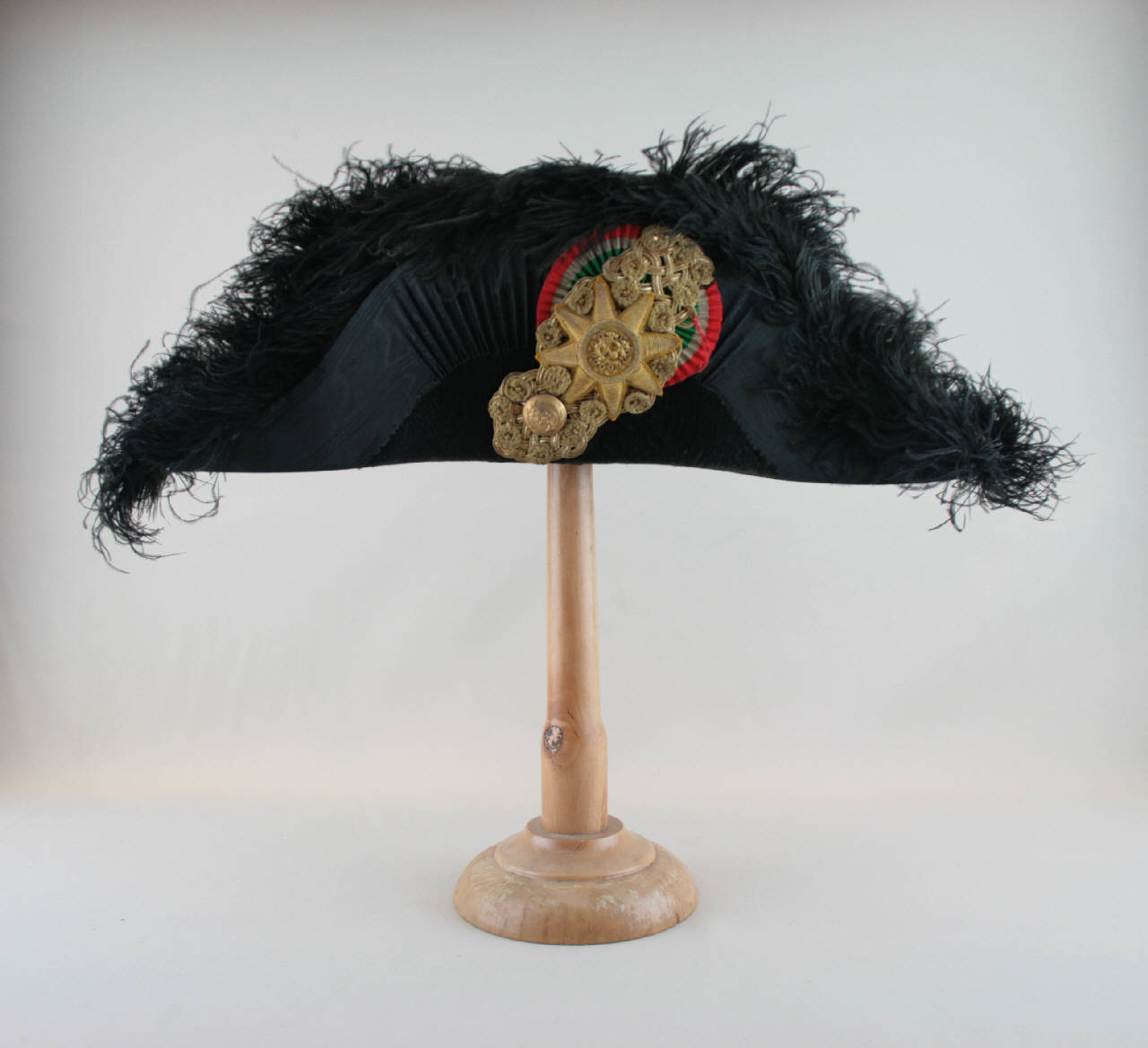 Bicorno o feluca in feltro nero con calotta a due ali rialzate, guarnite con piume di struzzo bianche e un nastro in taffetas nero marezzato; ornamento definito da patta ricamata con canutiglia dorata e paillettes con cornici circolari che incorniciano una stella con monogramma di Vittorio Emanuele IIII (realizzata su teletta dorata) e bottone con fiore, coccarda in raso di seta col tricolore italiano. Fodera in raso nero su cui è cucita l'etichetta.