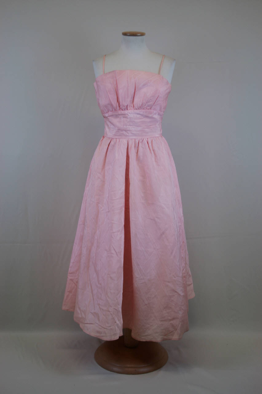 Abito lungo in taffetas rosa marezzato, scollo totale con sottili spallini; il corpino, sagomato da tagli, è coperto da una alta gala arricciata che parte dal un taglio sotto al seno che simula una alta cintura; taglio in vita da cui parte la gonna arricciata in sbieco, ottenuta unendo quattro teli svasati; dorso con cucitura centrale, dove è inserita la cerniera. Ai fianchi sono cuciti due nastri che si legano sul retro. La gonna è foderata con una baschina in taffetas rosa, a cui è unita una alta balza in tulle rosa.