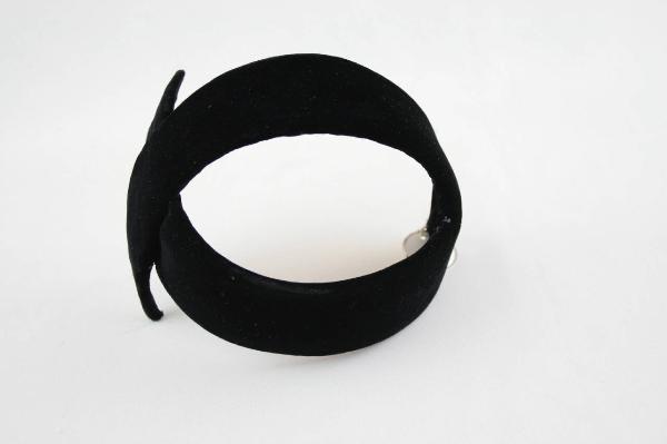 Acconciatura definita da due nastri in velluto nero (resi rigidi da una struttura probabuilmente in fil di ferro) che si incrociano e terminando con un motivo a coda di rondine.