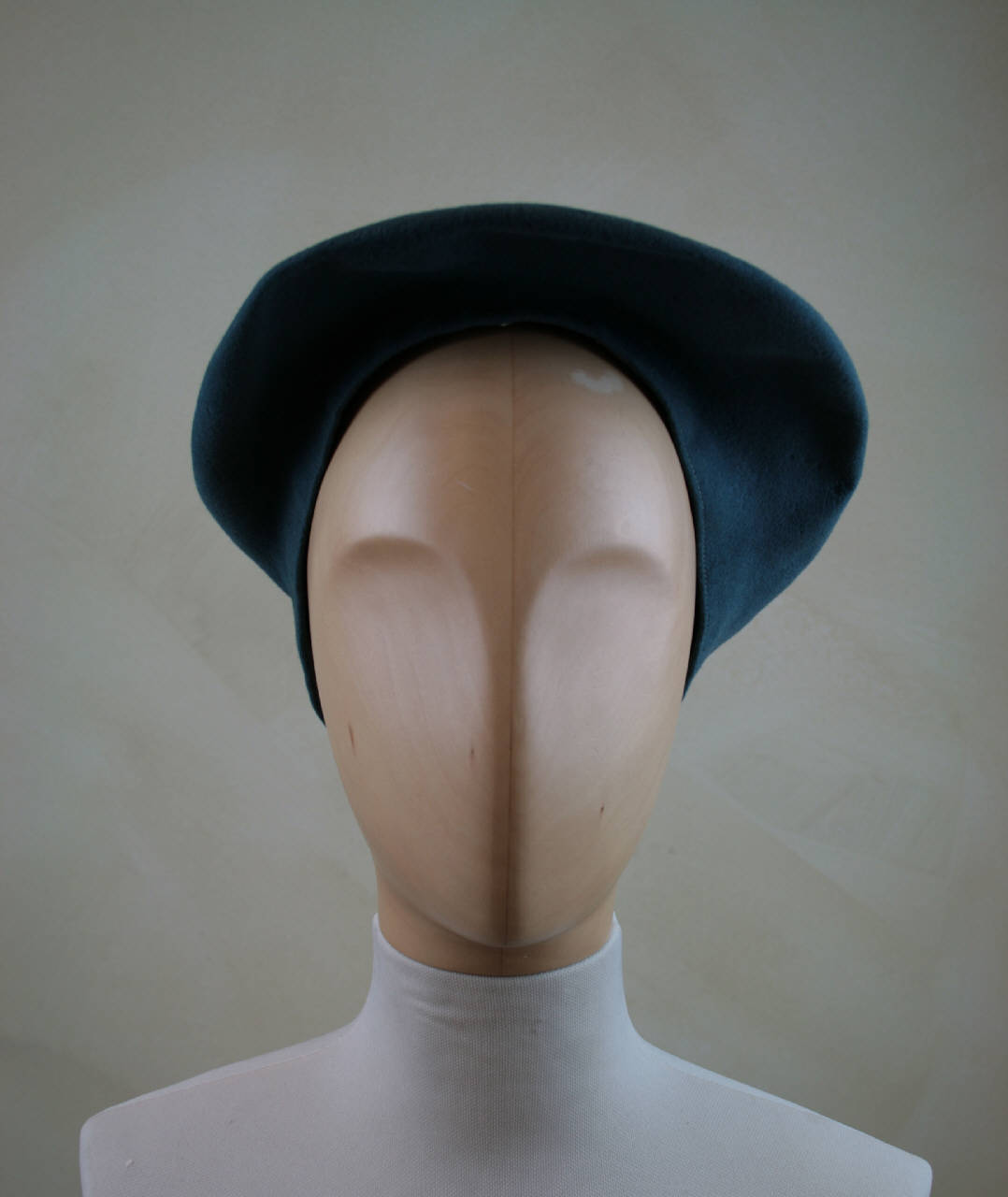 Basco con cupola rotonda in feltro azzurro, decorata con un motivo di due triangoli impunturati che si sovrappongono. Al giro d'entrata nastro in gros grigio su cui è cucita l'eichetta.