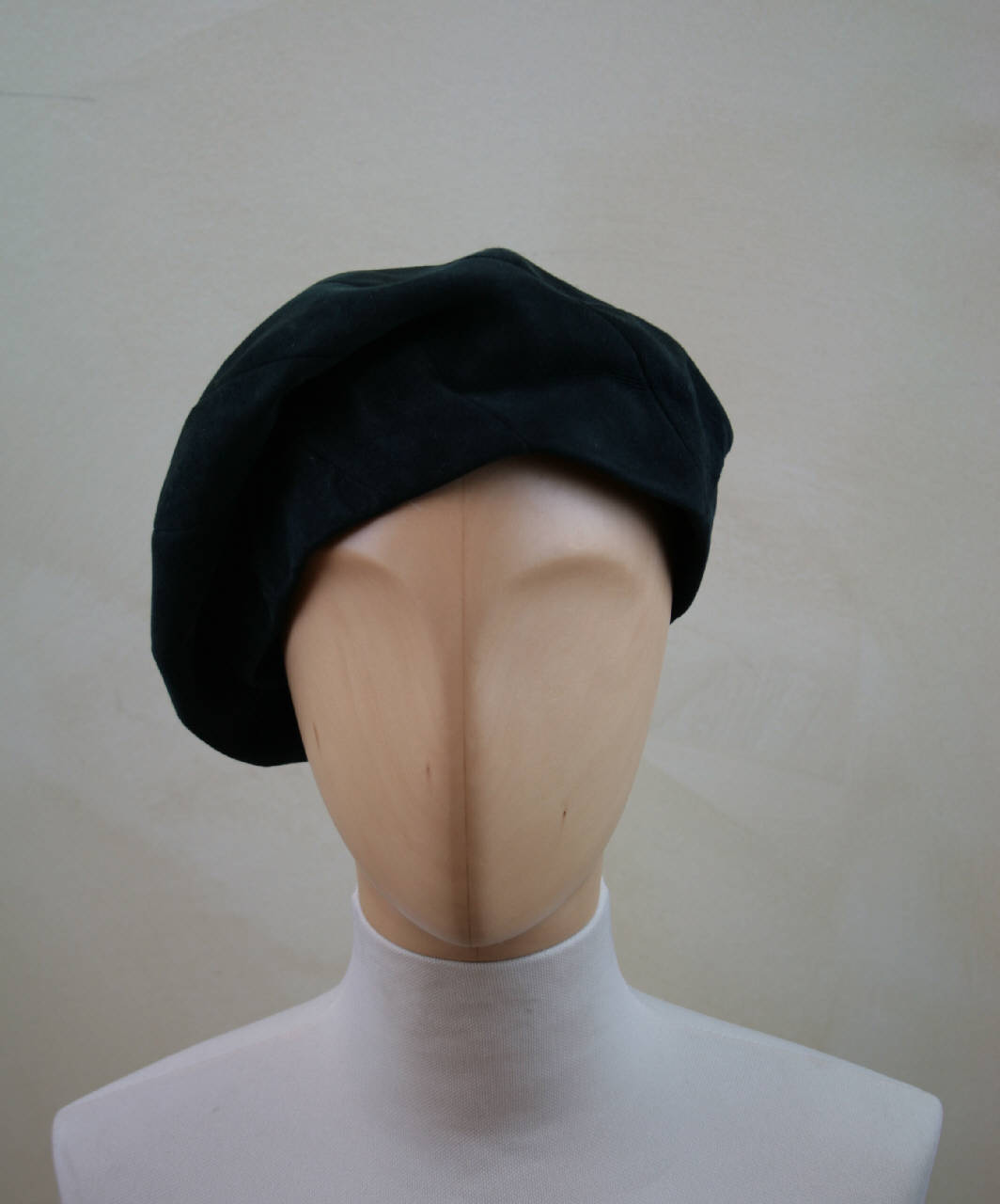 Basco in camoscio blu scuro con cupola rotonda realizzata da spicchi sinuosi che continuano nell'ala a bordi calati. Fodera in taffetas nocciola. Al giro d'entrata nastro in gros blu.