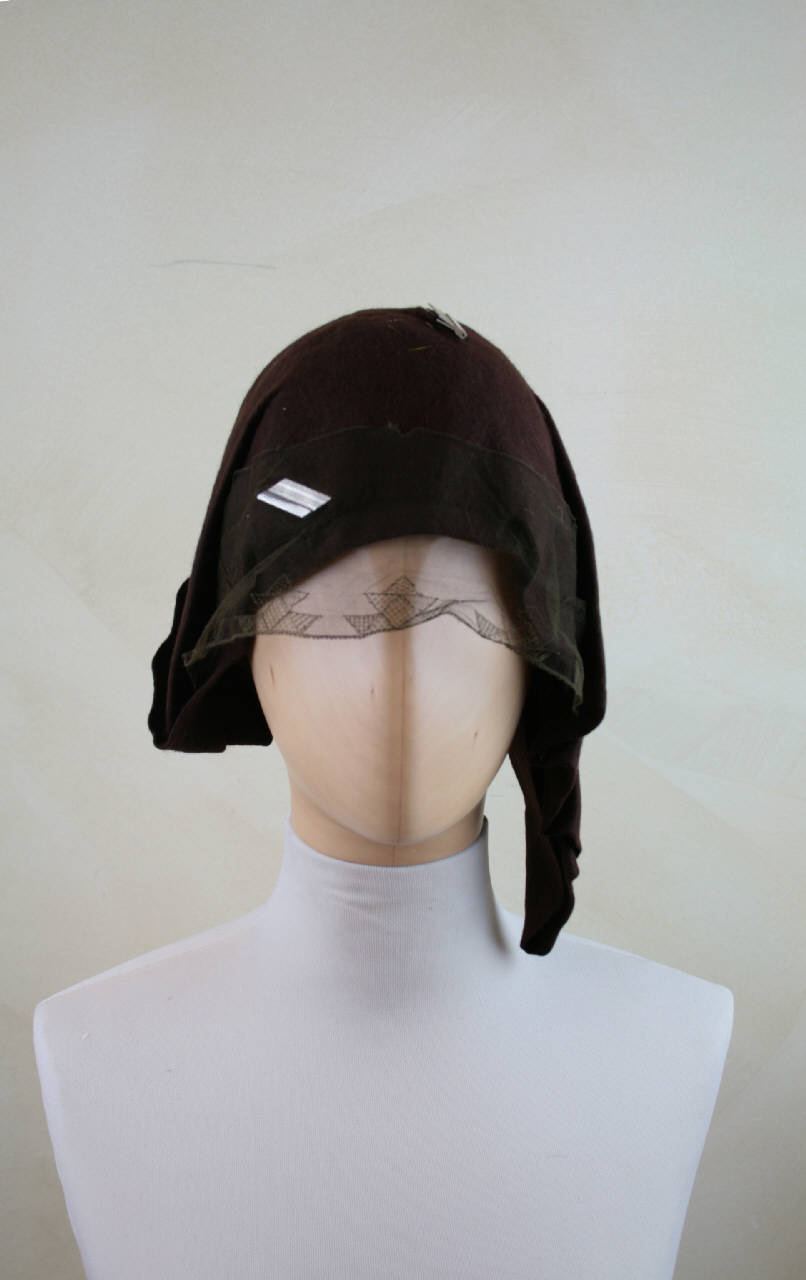 Copricapo in feltro marrone con piccola cupola rotonda decorata, da un lato, da un lembo asimmetrico pieghettato che accarezza la guancia e, dall'altro da un lungo lembo pieghettato, ripiegato sulla calotta. Completano il copricapo una veletta in tulle con motivi geometrici sul bordo e due placchete in metallo argentato. Nastro al giro d'entrata in gros marrone. Fodera con coulisse in taffetas nocciola, dov'è cucita l'etichetta.