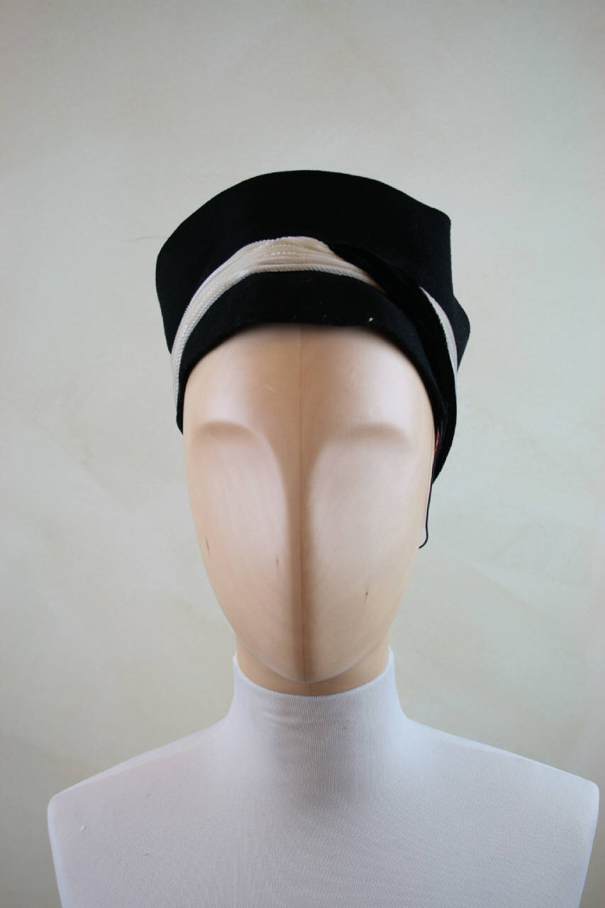 Cappello in feltro nero, con piccola calotta rotonda celata da un'alta banda in feltro che, sul retro, forma un fiocco; cinturino formato da due nastri intrecciati fra loro, uno nero e uno bianco e ala dai bordi calati. Al giro d'entrata nastro in gros nero dove è attaccata l'etichetta. Elastico per trattenere il copricapo alla nuca.