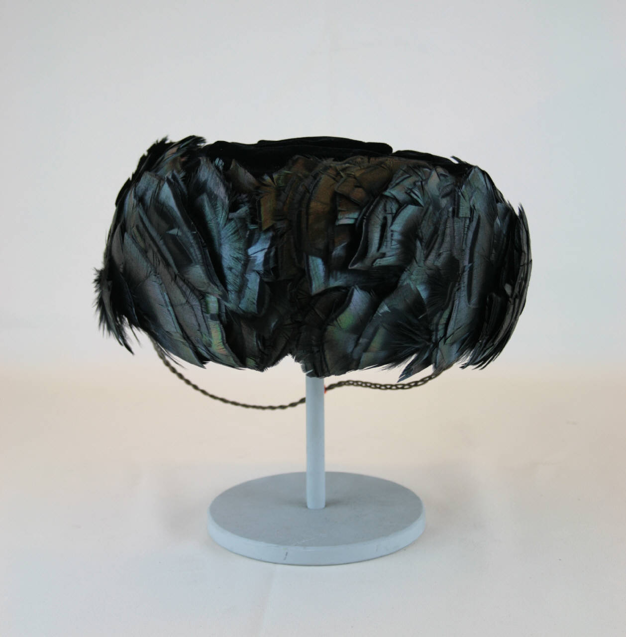 Toque con calotta rotonda in velluto nero increspato e decorato, lungo il bordo, da piume di gallo cedrone, su base di tulle; sul retro è applicato un fiocco. Fodera in taffetas nero ed elastico per trattenere il copricapo alla nuca.