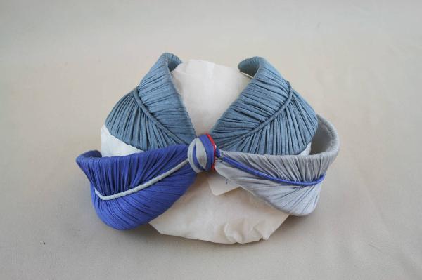 Acconciatura definita da quattro "foglie" in jersey grigio, celeste e azzurro. Sul rovescio è cucita l'etichetta ed è posta una molletta atta a trattenere il manufatto.