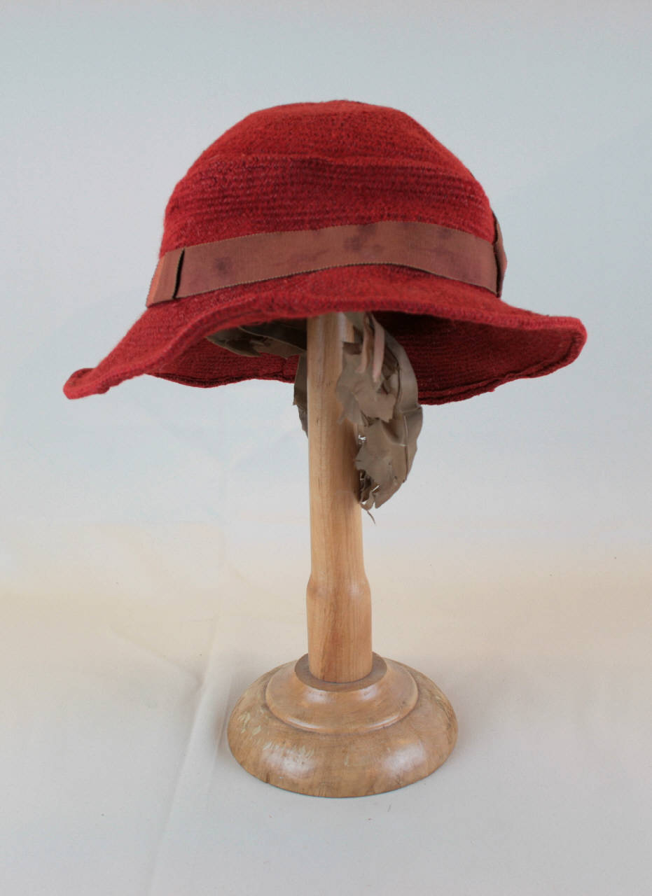Cloche in paglia e lana rossa intrecciati, calotta arrotondata con piega anteriore e tesa rigida, cinta definita da due nastri sovrapposti in gros (uno marrone e uno mattone) con i lembi rialzati e fermati sulla calotta, fodera in taffetas nocciola su cui è cucita l'etichetta.