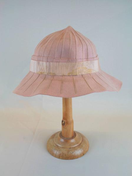 Cloche in feltro rosa, calotta, arrotondata e terminante in alto con una punta, percorsa da nervature che proseguono anche sulla tesa, cinta definita da un nastro in gros rosa, sopra alla quale è una nervatura orizzontale. Al giro d'entrata alta fascia in taffetas nocciola su cui è cucita l'etichetta. All'interno, sulla parte terminale della calotta, corre un nastro di gros nocciola.