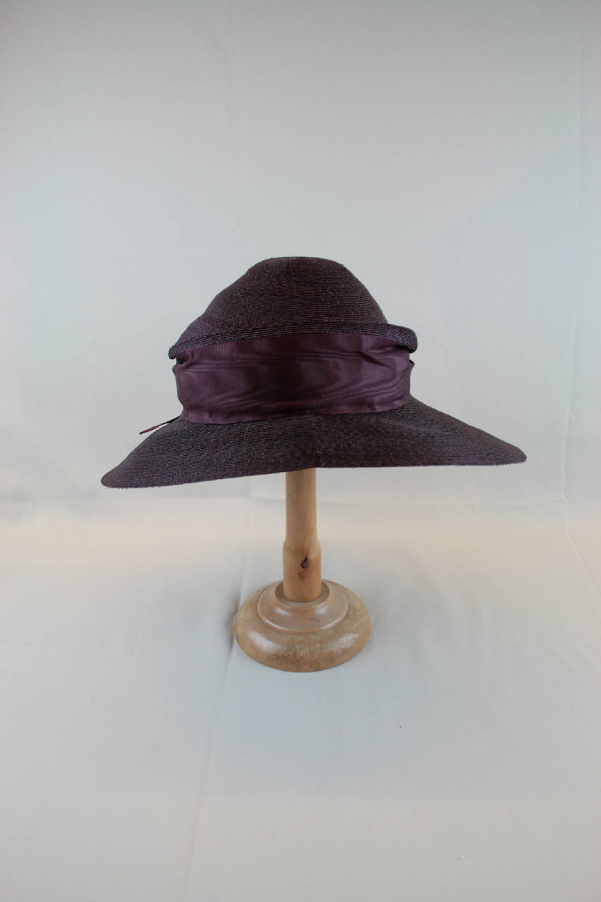 Cappello in paglia viola con calotta arrotondata, decorata da una piega, alta cinta in taffetas viola che forma un fiocco sul rovescio. Fodera in taffetas nocciola su cui è cucita l'etichetta.
