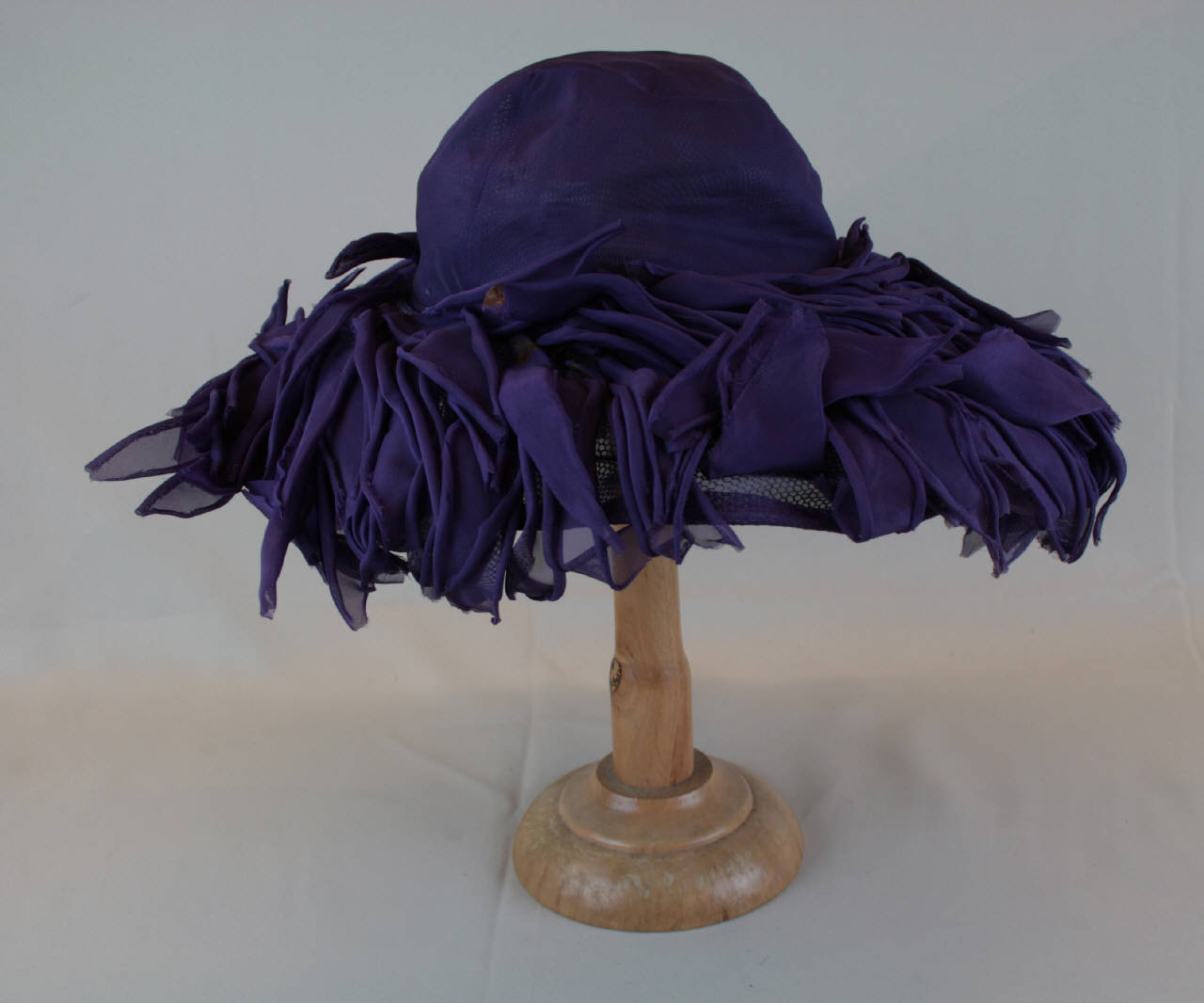 Cappello con calotta arrotondata e tesa rigida in tulle, con la cupola rivestita in organza viola, impiegata anhe per confezionare dei "petali" che coprono la tesa; nastro nero al giro d'entrata, dov'è cucita l'etichetta.