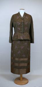Completo in gros di seta verde salvia ricamato a ramages in cotone a punto catenella e paillettes viola sagomate. Giacca monopetto, chiusura totale definita da 5 bottoni ed altrettanti occhielli; scollo con risvolti diritti, busto sagomato da pinces; maniche lunghe dritte a chimono con tassello; dorso con cucitura centrale e pinces; fodera in raso in tono. Gonna longuette dritta , priva di cinturino, cerniera parziale a sinistra; alto bordo ai fianchi in gros ricamato; la gonna è ritmata da orizzontali bande in raso nocciola intervallate da bande in gros.