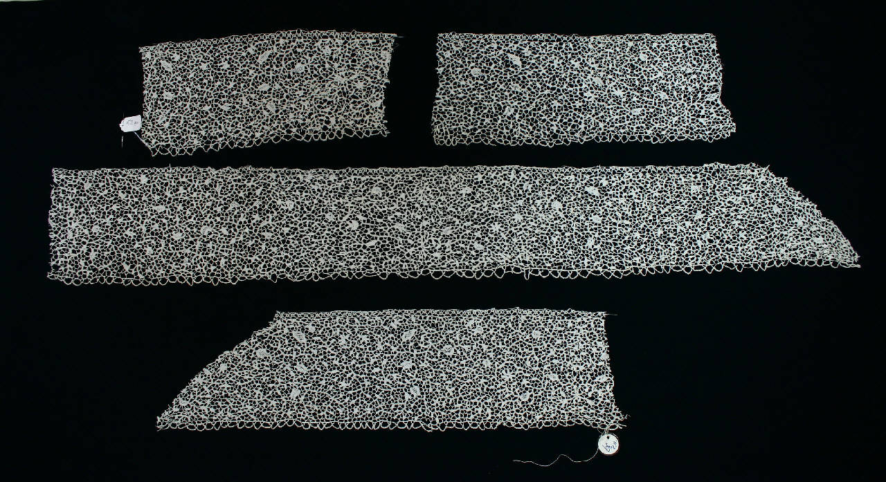 4 frammenti di bordo in lino avorio, decorato con motivi vegetali fortemente stilizzati realizzati a punto festone, disposti in una composizione apparentemente caotica, uniti fra loro mediante barrette con picot. Piede sottolineato da un bordino decorato dalla successione di quadrifogli stilizzati; il lato inferiore è rifinito con un bordo smerlato. Due frammenti sono rettangolari e altri due presentano uno dei lati brevi tagliato diagonalmente.