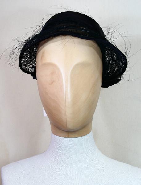 Cappello in tulle nero con calotta bassa rivestita in raso nero che forma sul retro un fiocco, e piccola tesa impreziosita da aigrette nere.