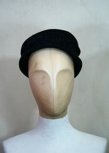 Toque in paglia verniciata di nero, a calotta modellata da un drappeggio e bordo irrigidito da ferrino; giro d'entrata in gros nero.