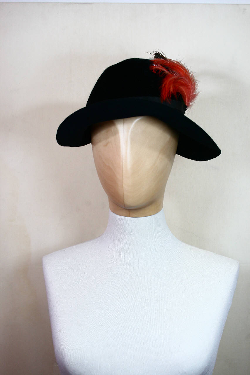 Cappello in feltro nero, piccola calotta e tesa sagomata ovoidale; cinta in cannettato (ordito seta e trama cotone) nero che forma un fiocco sul retro e che trattiene piume nocciola e arancioni.