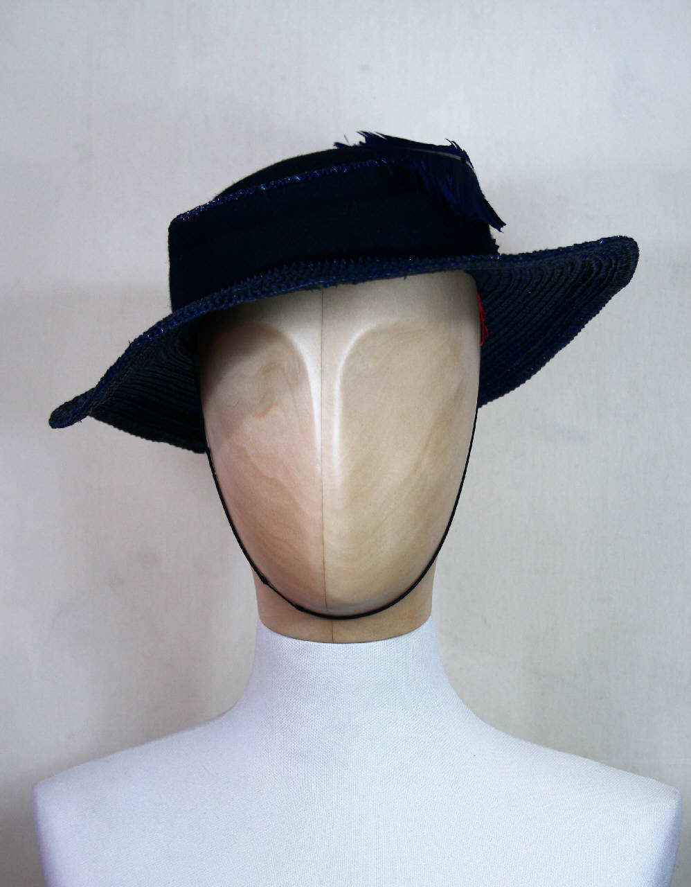Cappello con piccola calotta cilindrica in feltro blu bordata in paglia blu; tesa circolare in paglia blu. Giro d'entrata in cannettato misto blu (ordito in seta e trama in cotone).