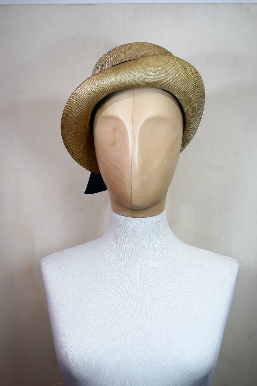 Cappello in paglia con alta calotta arrotondata e con disco superiore, cinta in cannettato blu che forma ricco fiocco, tesa asimmetrica sollevata da un lato; giro d'entrata in taffetas blu.