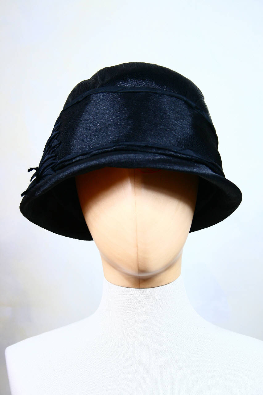 Cloche in paglia nera con calotta a campana alta, con disco superiore bombato, decorata da una coccarda in cannettato nero; piccola tesa; fodera in taffetas nero.