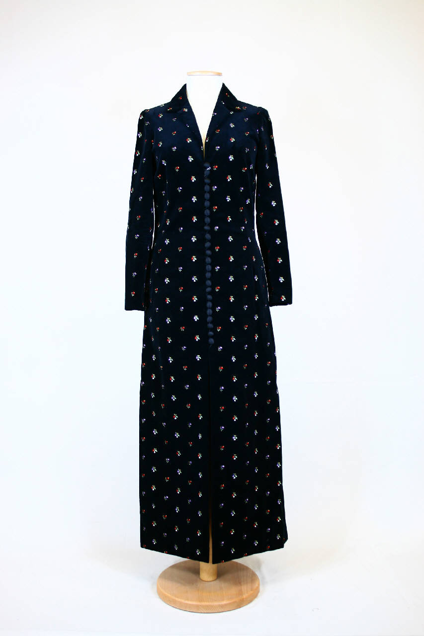 Abito lungo in velluto tagliato nero ricamato con cotone policromo (verde rosso, lilla, bianco) a piccoli mazzetti disposti a scacchiera. Collo con risvolti a punte dritte, apertura totale definita da 24 bottoni rivestiti in tessuto e altrettate asole, busto modellato da pinces e gonna svasata; manica lunga dritta, con spacco al polso chiuso da 6 bottoni con asole; retro con cucitura centrale. L'orlo è rifinito, al rovescio, con organza nera.