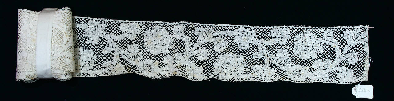 Bordo in lino avorio, fondo a rete tipo Valenciennes a maglie romboidali e decoro a punto tela e a mezzo punto. Il decoro è dato da un sinuoso tralcio carico di fiori a palmetta e foglie arricciate.