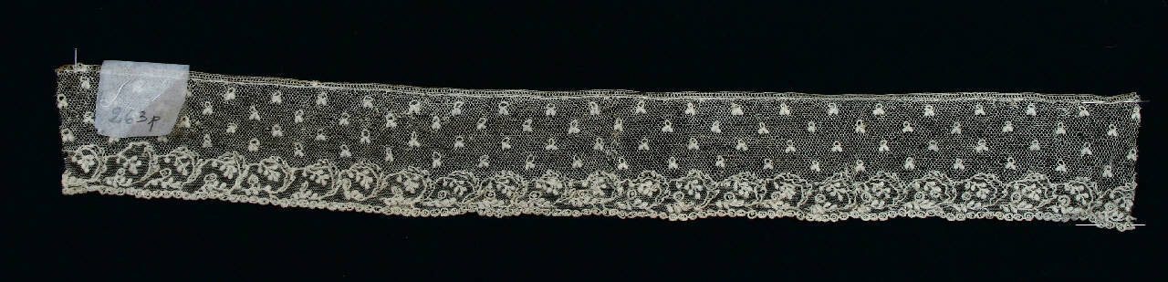 Bordo in lino avorio, fondo a rete a maglie esagonali (nell'inventario definito tulle meccanico) su cui si stagliano frutti stilizzati, profilati da cordonetto a punto occhiello con riempitivi a punto tela, disposti a scacchiera; rete più leggera lungo il bordo, decorata con rami fioriti e fronzuti, profilati da cordonetto a punto occhiello con riempitivi a punto tela, orlo smerlato rifinito con un cordoncino a punto festone ripiegato a cerchio; piedino a fuselli.
