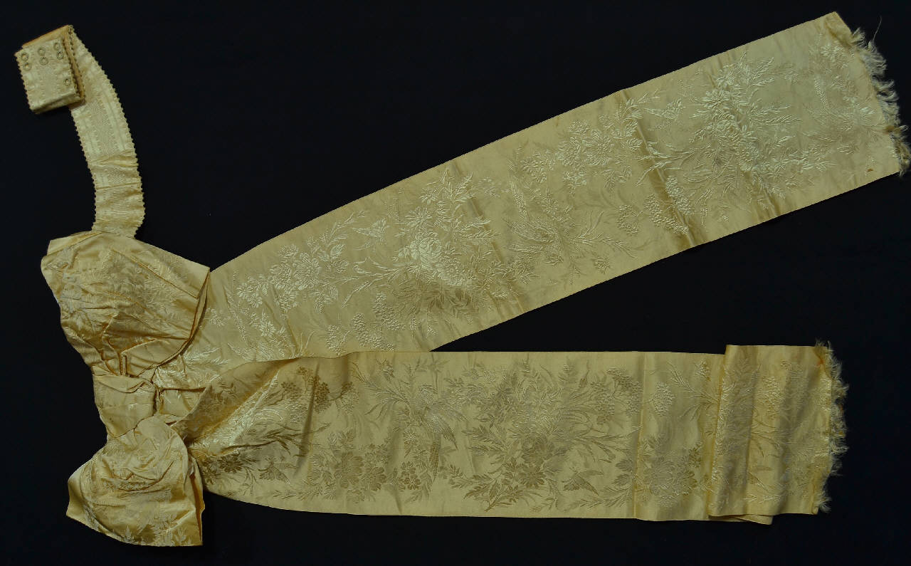 Cintura confezionata in pèkin avorio (raso e cannellato) sagomata da pinces e chiusa mediante 2 ganci in metallo e 6 occhielli circolari rifiniti a punto festone; sulla cintura è presente un settimo occhiello. Alla cintura è unito un ricco fiocco confezionato con un altro nastro in damasco operato liseré avorio, decorato da tralci fioriti e fronzuti su cui sono appollaiati piccoli uccelli.