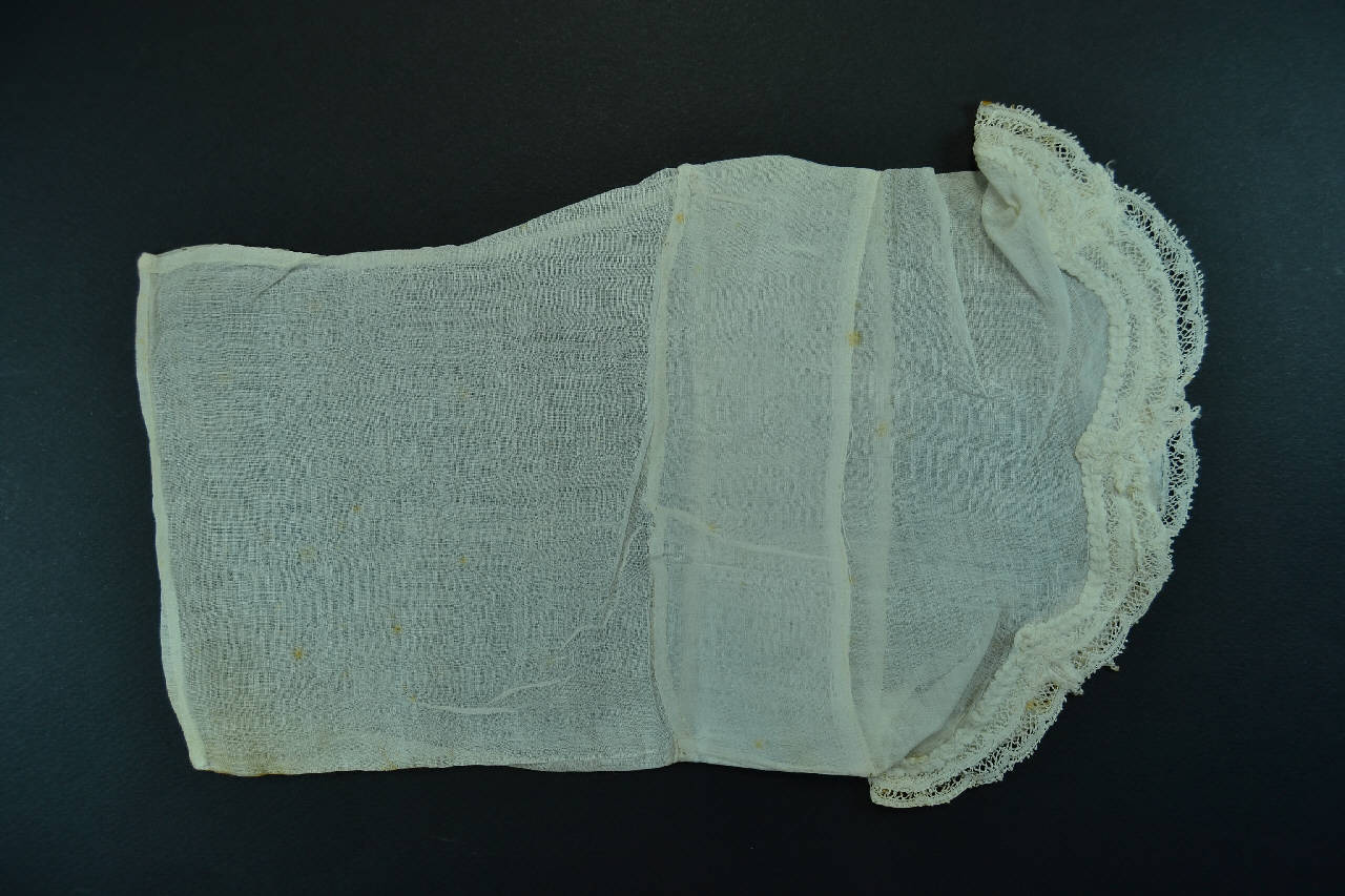 sottomanica in un pezzo in tela di lino avorio, con alto polso a cui si collega una balza con l'orlo rifinito da due balze in merletto meccanico ad imitazione di pizzo a fuselli, con orlo smerlato percorso da cappietti. Sul merletto sono poste applicazioni a foggia di foglia e a serto fronzuto eseguite a ricamo a punto pieno.