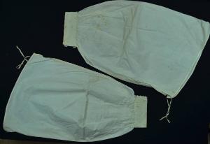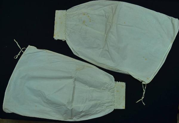 Paio di sottomaniche blusanti in lino avorio in un pezzo, con una coppia di fettucce poste sull'orlo superiore; polso a listino chiuso da due bottoni in madreperle e due asole; risvolto ricamato in cotone con bordo smerlato a punto festone e con piccole foglie a punto pieno; un motivo a giorno delimita un motivo di piccoli rettangoli inseriti entro cornici rettangolari con i vertici sottolineati da un motivo traforato.