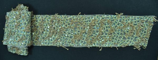 banda in tulle sintetico ghiaccio, completamente ricoperto da un fitto ricamo definito da una rete a maglie irregolari in ciniglia avorio che racchiudono pailletes e perline turchesi; il decoro è completato da piccole briglie in perline color ambra.