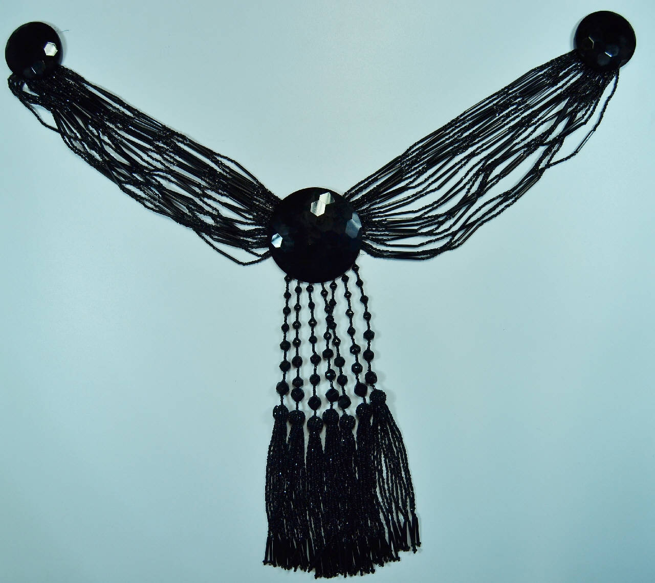 la decorazione è definita da 3 dischi sfaccettati di jais, incollati su tela nera; i dischi sono collegati fra loro da fili in perline e cannette; sul terzo disco, di maggiori dimensioni, sono presenti 7 fili con perle sfaccettate di misura crescente e terminanti con un fiocco in jais. Sul rovescio dei due dischi minori sono poste delle asole volanti.