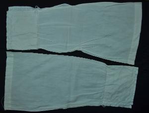 paio di sottomaniche in tela banca, leggermente blusanti, con spacco all'alteza del polso e alto polsino inamidato, decorato lungo l'orlo da un motivo a scacchiera realizzato a punto ombra e rifinito da orlo a giorno. Chiusura definita da un bottone e un'asola.